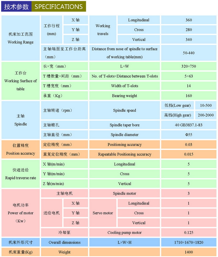 本机床采用铸件,铸件结构合理。长导轨加入耐磨合金元素,耐磨性更高;短导轨采用贴塑导轨,摩擦系数小,运动灵活,使用寿命长。X、Y、Z三方向进给运动均采用滚珠丝杠,运动更精确。主轴为变频无调速控制方式,采用国产铣床专用变频主轴电机及进口变频器。主轴分为高速、低档,两档速控制,低档时大扭矩可达160Nm。该机床有立、卧两主轴,配合数控转台及特殊附件可使其加工范围更广。润滑系统为自动润滑,使机床导轨、丝杠、轴承润滑更充分,提高机床寿命,提高精度及稳定性。XK8132数控万能工具铣床主轴可依客户需要配置告诉铣削用电主轴,该主轴具有高精度、高转速、振动噪声低等优良特性。